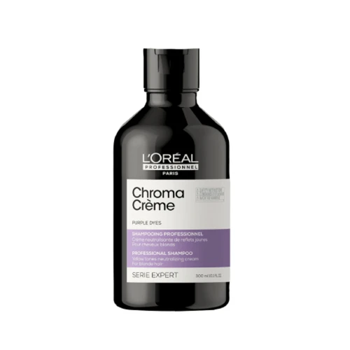 Chroma Crème is a trio of neutralizing cream shampoos that provide instant color correction tailored to all hair colors, with intense care. Freshly colored hair contains a mix of primary color dyes. After a few washes, some of the dyes fades. Warm reflects such as yellow, orange, or red reappear. As purple neutralizes yellow reflects, choose Purple Chroma Crème for blondes to platinum blondes.