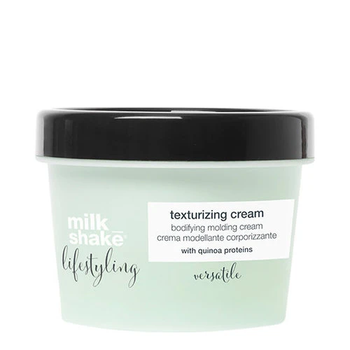 milkshake lifestyling texturizing cream is particularly suitable for fine hair, when applied to dry hair it gives body, giving separation and control to hair strands for creative and unkempt looks. Contains organic fruit extracts, quinoa, and milk proteins, Integrity 41, and a UV filter to protect hair.